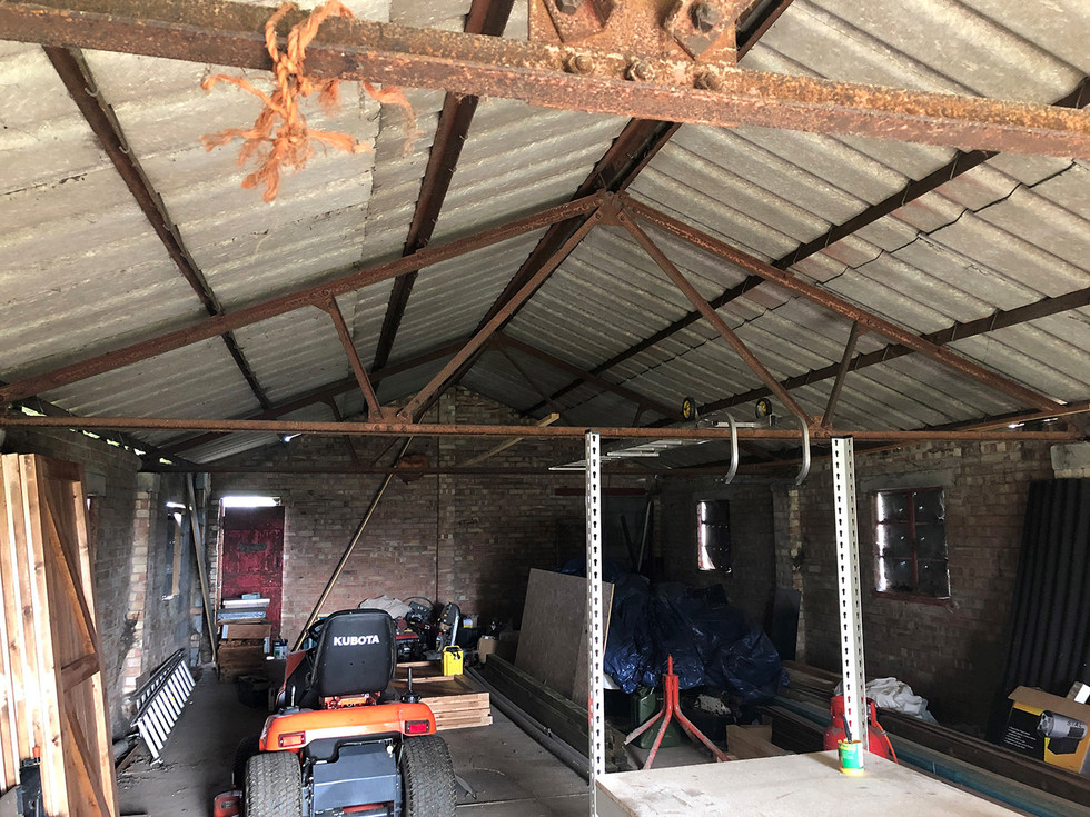 At the north west corner of our property lies the apple storage barn built in the early 1970s. It is essentially a simple rectangular building approximately 16m long x 6.5m wide with walls of single skin brick (with support pillars every 4m or so) and an asbestos roof supported on a steel frame. It is joined to another smaller (converted) barn (that we don’t own) and has large double sliding doors at one end with two standard doorways at the other (in the corners), one of which was bricked up. At some point the barn had been driven into (with a tractor apparently) and this had moved a section of the roof at the south end of the building by about 150mm and caused a partial wall collapse that had been repaired using thermalite block although the roof was not fully back in the right place. The opposing wall had also moved due to the entire steel roof ‘A frame’ moving as part of the impact and ‘shoving’ the opposing wall in the process. All in all, the barn was not in a great state of repair although it was perfectly serviceable for storage and the likes and that is what we initially used it for.