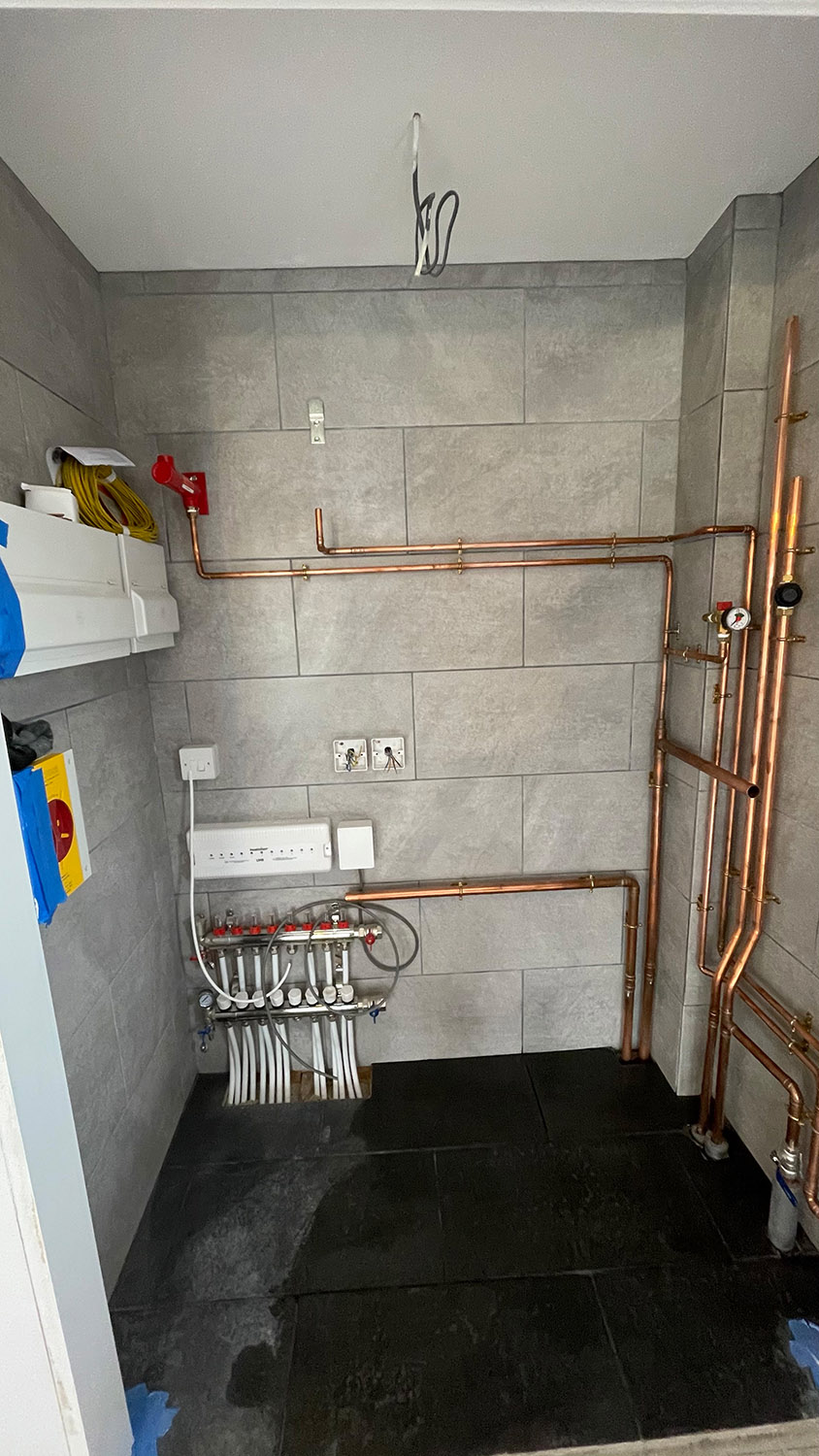 Once the consumer unit was commissioned installation of the air source heat pump and associated pre-plumbed cylinder and underfloor heating controller could begin. Initially the wiring for the Heatmiser underfloor heating controller, the pre-plumbed cylinder and the immersion heater were routed into the back of the plant cupboard (again via the wall behind having not being boarded just like the cupboard). The Heatmiser unit was mounted as was the underfloor heating manifold. Each room then had its thermostat mounted, wired and the relevant connection made from each thermostat into the back of the control unit. After this the plumbing work could begin with copper tube used throughout and mounted to the walls via Munsen brackets as these would be seen hence the neatest job possible was the order of the day. In a similar vein care was taken to ensure all pipes were running straight and true.
