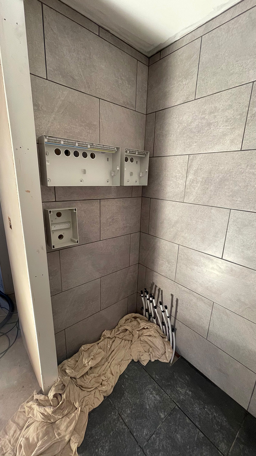The plant cupboard was tiled both on the walls and floor in readiness for the installation of the heating and hot water system. Once this was done installing and commissioning the new consumer unit was first on the agenda. This was to be installed in the plant room, but a problem arose with the number of circuits due to the need for twin RCDs and surge protectors in the consumer unit meaning these took up ‘slots’ in the unit’s capacity and left us with a circuit over the maximum number available in a single unit. The solution was to add a second consumer unit and use a master isolator switch wired via a Henley block to split the supply to the two units. The consumer units selected were MK as these are a good balance of quality and price and these were duly installed in the plant room with all the wiring being fed in the back via an internal wall void. Cunningly we had left the plasterboard off the back of this wall to facilitate cable installation and the plan was to board and plaster it once the wiring was complete.