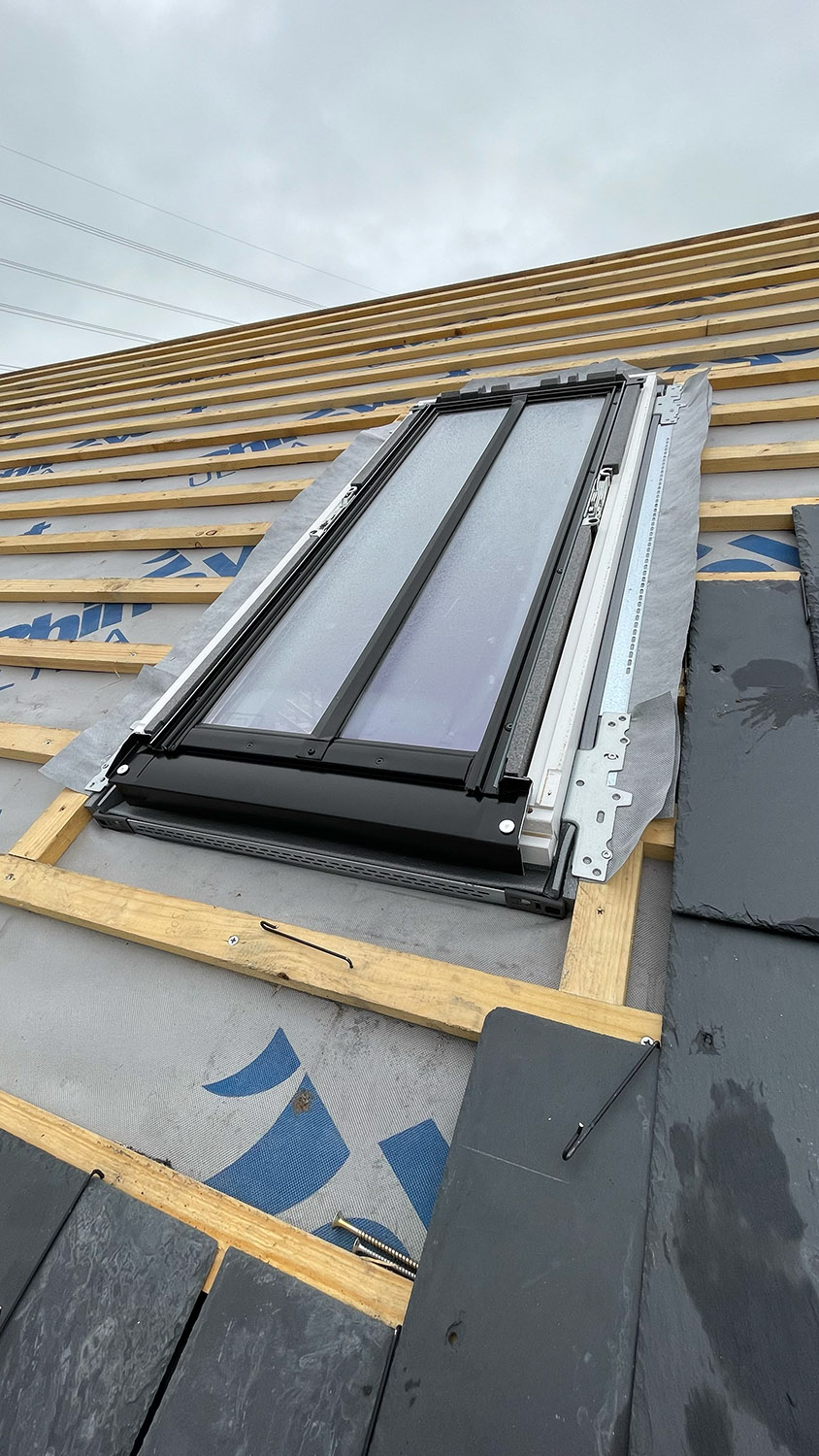 Once we had the new window in place we turned our attention back to the slating of the roof so now it was time to focus on installing the three remaining Velux windows prior to preparing and slating the valleys. The battens and membrane were cut away from the openings and the apertures were dressed ready to accept the windows which were then installed and levelled before being firmly screwed into position.