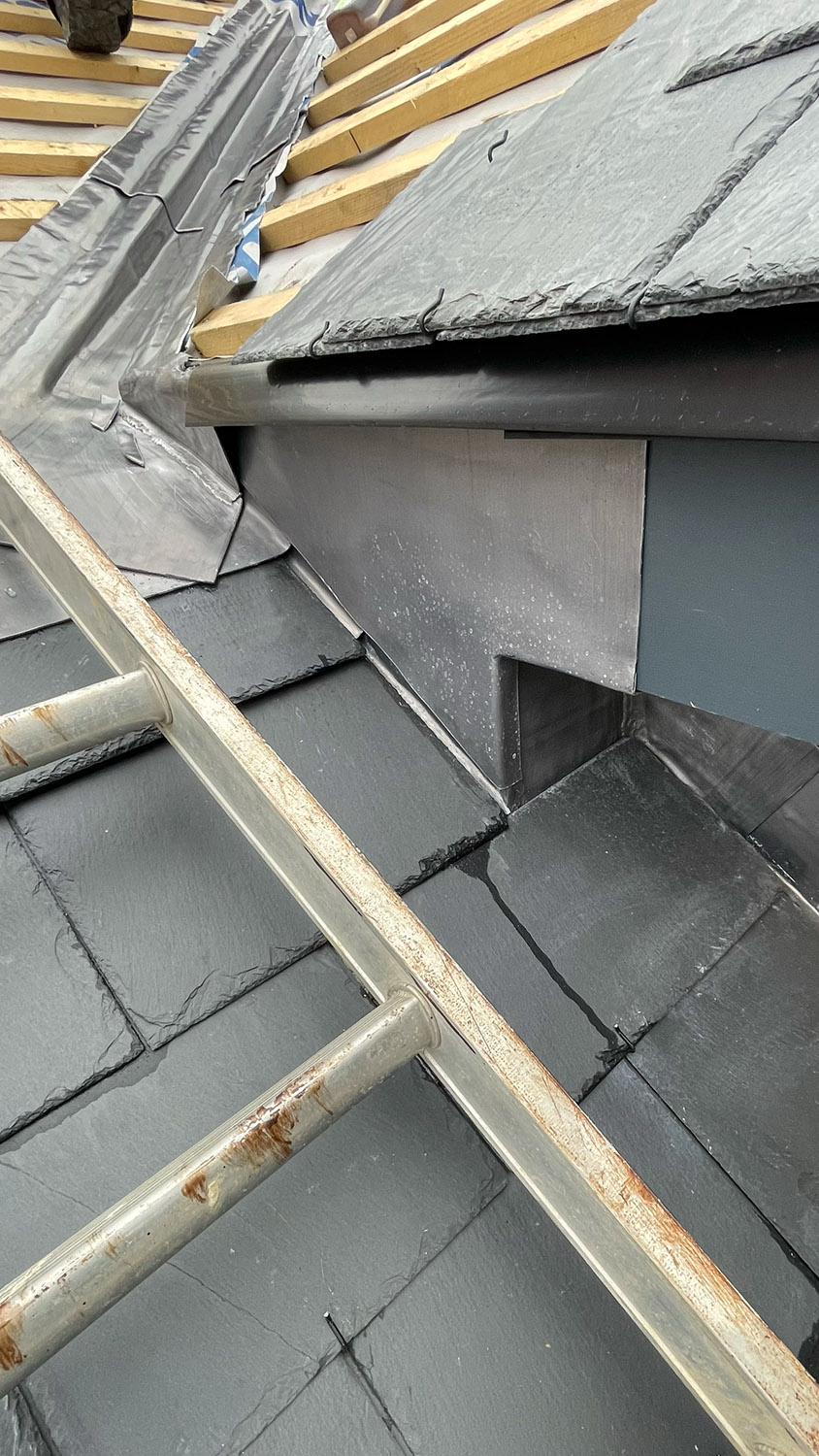 Both sides of the lower roof were then flashed with code 4 lead at both ends (against the new building and the mill) and slated up to where the higher roof intersected them. Focusing on the west side first a large code 5 lead soaker was laid at the bottom of the valley and the valley lead (also code 5) was then installed in 1.2m sections with a 150mm overlap and set so as to run onto this large soaker.