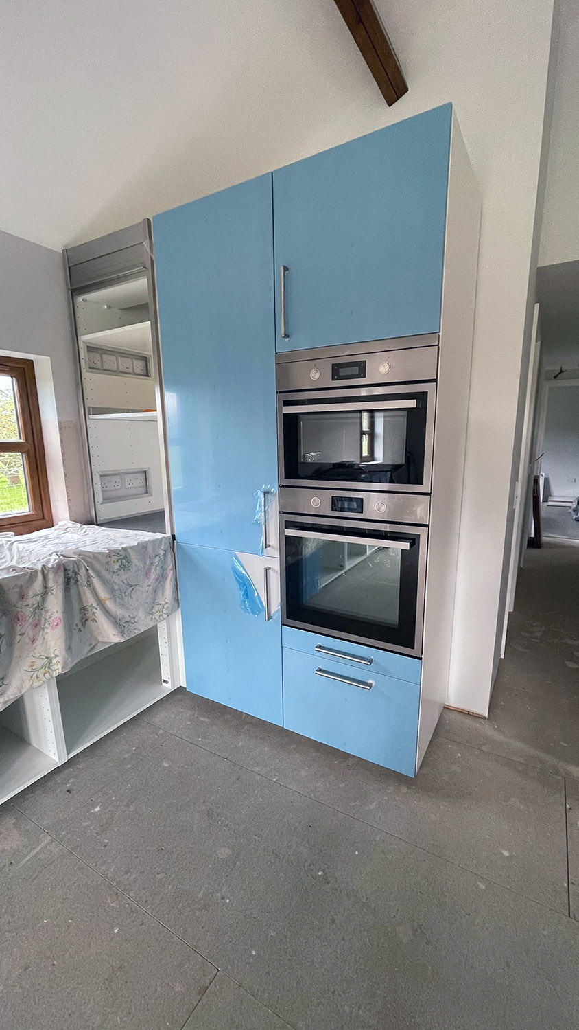 With the hard work with the kitchen done (units, plumbing, electrics) the finish line was now finally and genuinely in sight. The fridge/freezer, oven, microwave, hob and sink were the next to be installed followed by the doors and drawers and the island unit was then built up and secured to the floor.