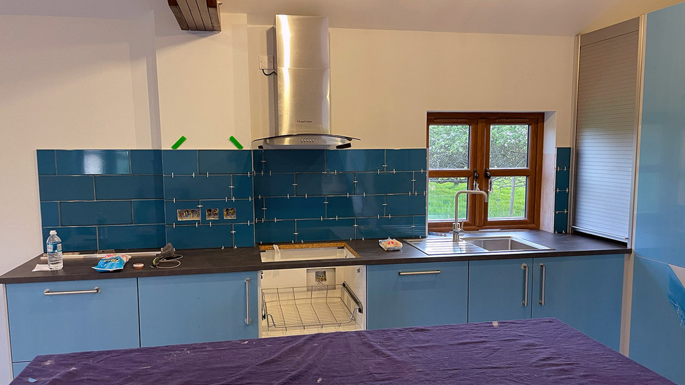 The living area/kitchen was floored out with the Quickstep laminate and the tiling carried out on the kitchen splashback. For the tiles we chose Fulham blue wall tiles from Tile Mountain, affixed them with Maipei adhesive and, like the bathroom wet areas, used Maipei epoxy white grout.