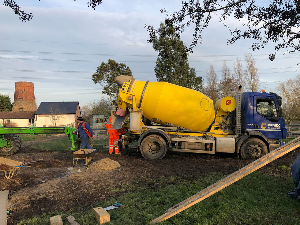 With the concrete shuttering built it was time for the ready mix truck to do its thing. Given we were still in winter at the time, and it had been quite wet and we’d recently been digging the ground the truck was given strict instructions to stick to the graded portions of the land and these were clearly indicated to the driver as otherwise I feared the truck sinking into the land and becoming beached. However, despite my best intentions all my instructions were completely ignored and the driver drove straight off the graded area and duly got bogged down and stuck. This had two consequences, the first being that we had to barrow 3.5 cubic metres of concrete into the relevant shutterings rather than have them poured directly (as the mix was going off and the additional weight of it would make extraction of the truck nigh on impossible) and secondly the concrete company had to send a tele-handler to drag the now empty truck out of the mud. Anyway in amongst all of this shenanigans the concrete was installed and tamped to a finish ready to accept paving slabs aside from the air source heat pump platform that was smoothed as it was not having any additional covering.