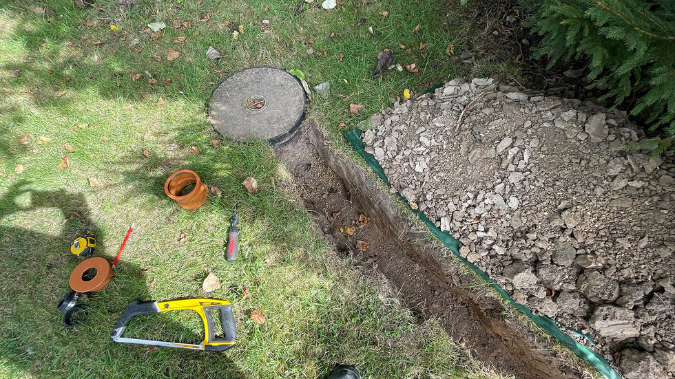 Next up a submersible stainless steel pump was installed in the base of the tank and the float switch adjusted to allow it to switch on to pump out when the water level reached the bottom of the inlet pipe and to switch off when the pump head was just out of the water. MDPE pipe was taken from the pump through the top of the tank and then via a right angle bend into a small trench that connected it to the discharge pipe via an inspection chamber that was already in place. The tank area was then backfilled and seeded to match the rest of the paddock.
