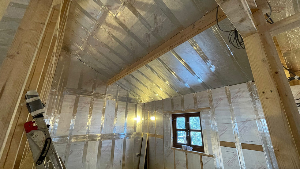 The vapour control layer was to be created by taping the insulation within the frames to the frames themselves before mounting the insulated plasterboard/further insulation over the top of these. While it’s not a huge building it is quite intricate in terms of the timber frame and various different apertures therein which combined with the number of rooms and the different heights of the vaulted ceilings made the insulation and vapour control layer installation a fairly significant amount of work that in all honesty took a bit longer than I expected. However, this is largely down to my underestimating the amount of work involved and at the end of the day I wanted a top job doing rather than us rushing it so no worries as they say down under.