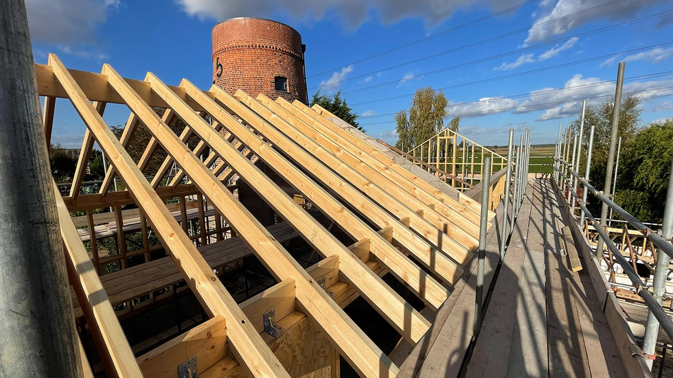 The first rafters and OSB cladding installed on the east end of the building.