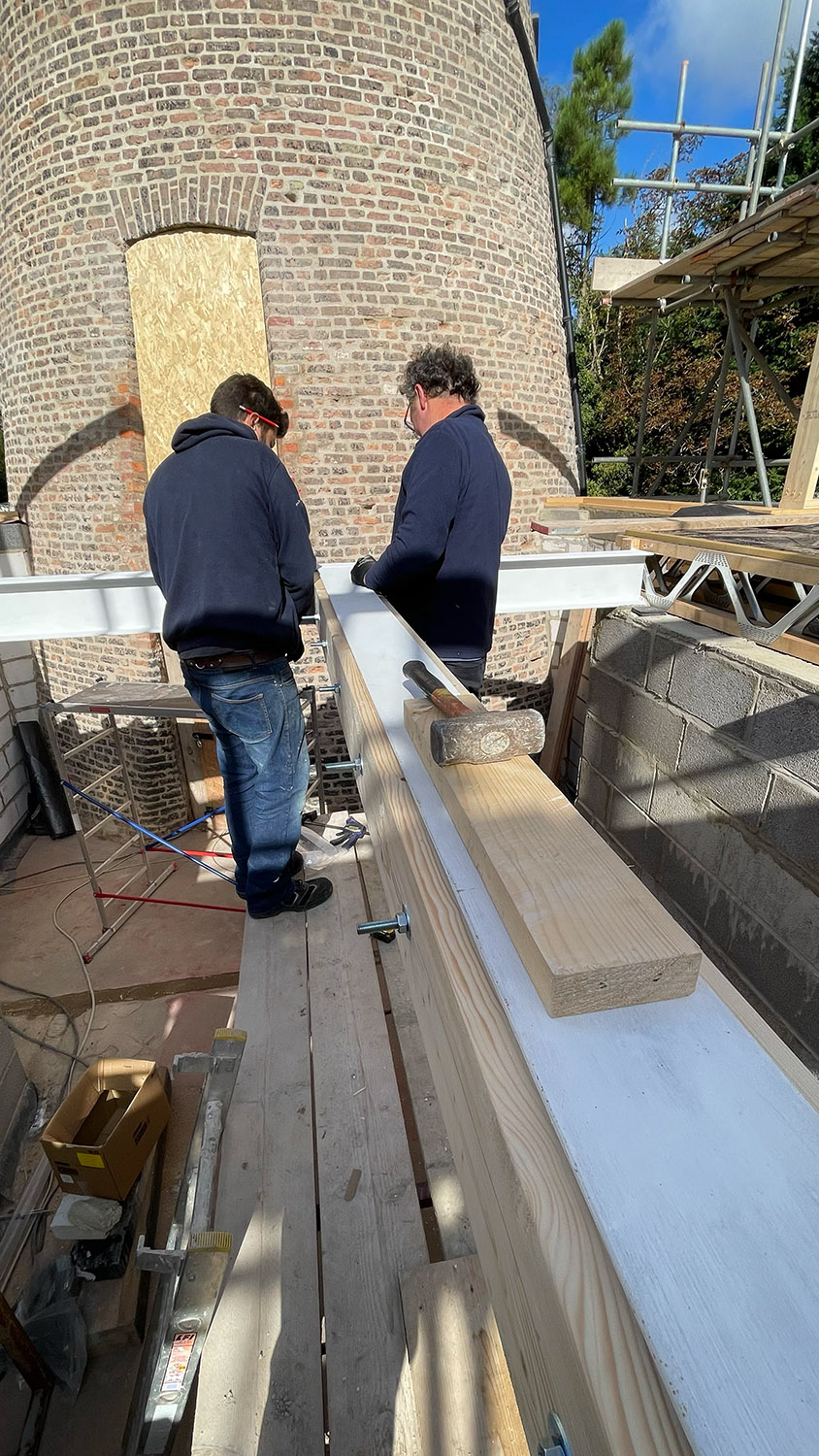 When the posi-joists were installed for the first floor the landing was left out as this is a much shorter span side to side (3.6m) which will work just fine with standard timber joists and needs the opening for the stairs as well as a support beam across the end of the double floored area where the bridge will eventually allow access to the mill within the double height ‘atrium’ (for want of a better expression). We were originally going to have a spiral staircase, but this idea was abandoned on cost and space grounds and instead we settled on a ‘floating’ staircase mounted up the side of the east internal wall. This meant we needed a sizeable opening and therefore it was decided to install two 203 x 133 UB steel beams, one across the end of the upper floored area and the other connected to this at 90 degrees to form the opening for the staircase and provide a mounting for the floor joists on the landing. The steel was sourced from a local supplier and the beam across the end of the first floor was fitted first with the second beam being bolted to it and positioned accordingly to form the staircase aperture.